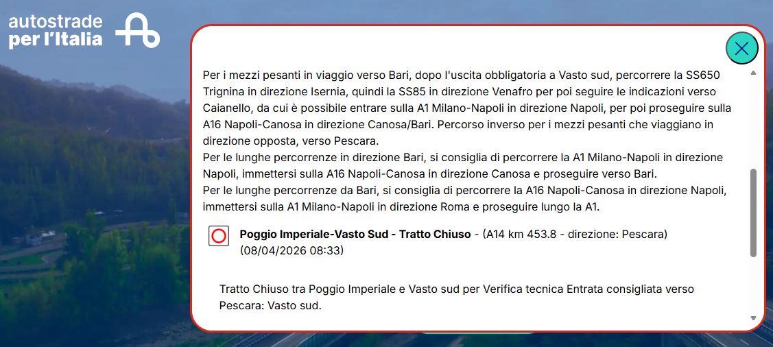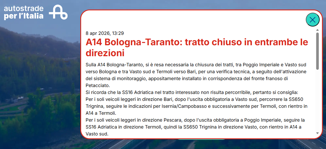 Comunichiamo nostro malgrado che a causa della frana di Petacciato in Molise, avvenuta in data martedì 7 aprile 2026, dalla settimana 15° del 2026 e a oggi senza purtroppo indicazioni sul ripristino, l’autostrada A14 Bologna-Taranto ha un tratto chiuso in entrambe le direzioni.